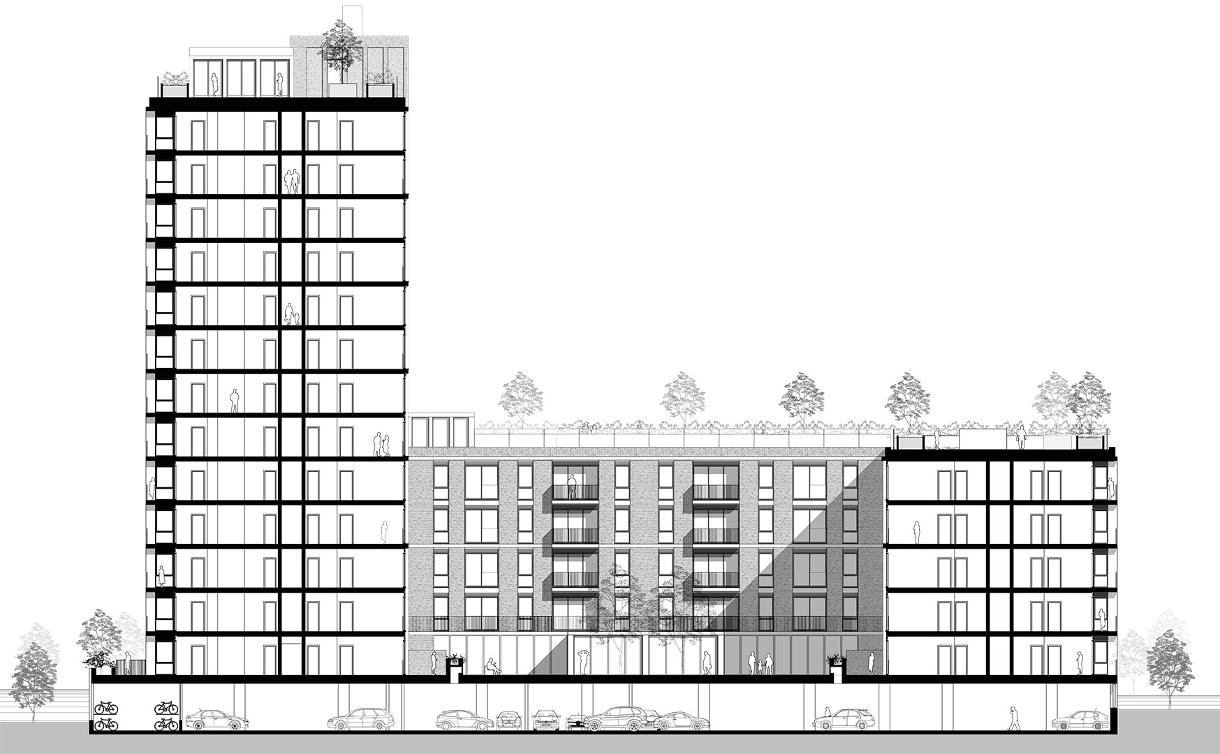 The approved building, that replaces an existing 3 storey office, rises in a series of steps from 5 to 14 storeys creating extensive landscaped resident amenity terraces with fine views over Milton Keynes and excellent solar access.