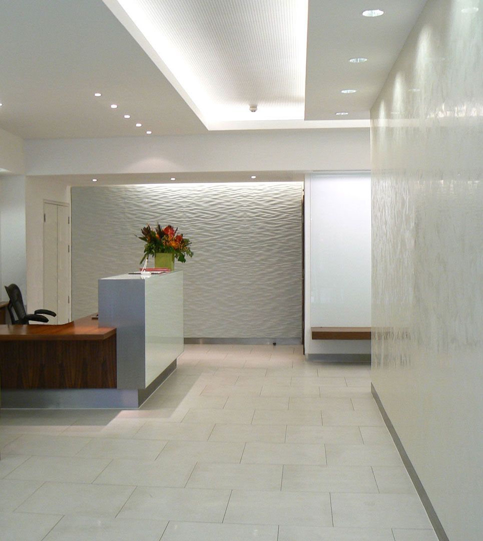 The common parts of this 23,000 sq ft office building provide a crisp contemporary aesthetic in keeping with its clean external lines. The reception area has cool white walls and limestone floors that are offset by highlighted sculptural wall panels. Subtle lighting features lead the visitor to the lift lobby where dark wood and baked glass give an elegance appropriate to the locality.